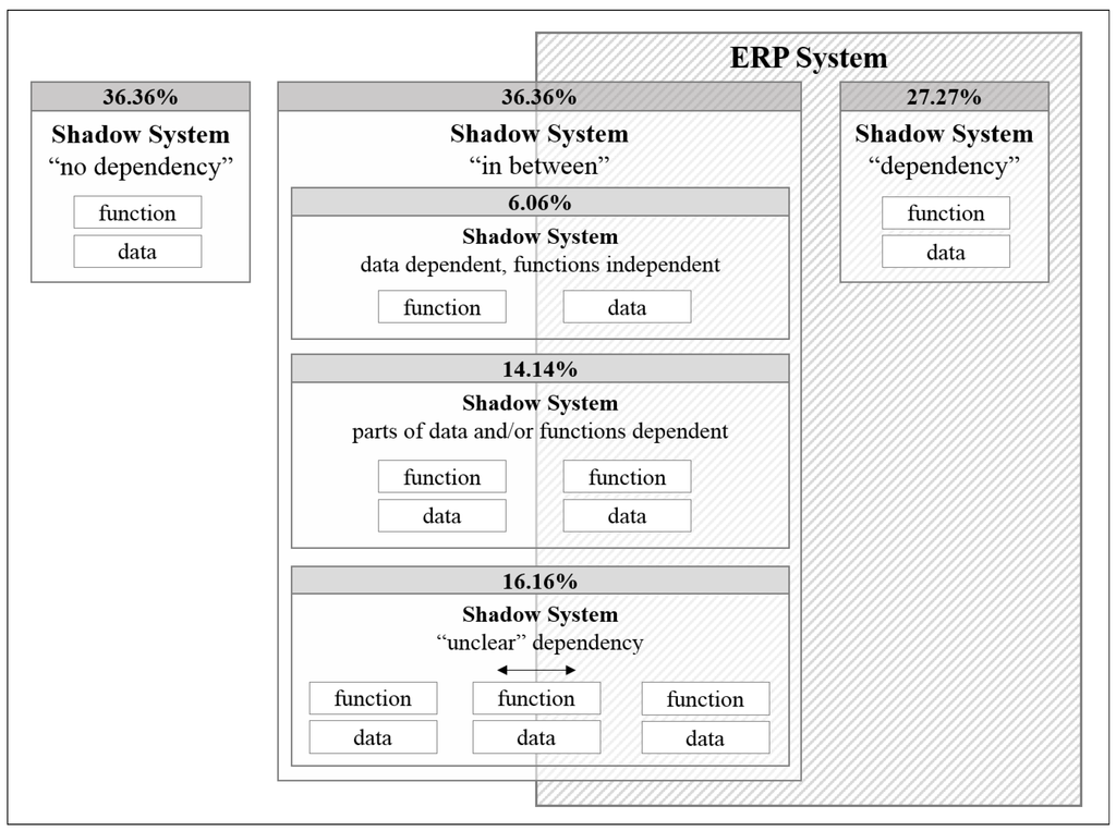 We found 27 shadow systems that are dependent on the ERP system, following our argumentation in the prior section. The systems are all in this category, because their functionality is one of the ERP systems of the analyzed organization. Additionally, the ERP systems share the data that the shadow system processes.