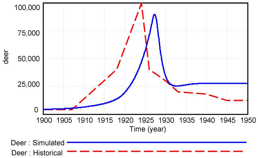 We use a computer simulation as dynamic task in the experiment [34], which is based on the Kaibab Plateau system dynamics model. This model is well documented in the literature [35]—Figure 1 depicts the overshoot and collapse behavior of a deer population which is represented in the model (for a structural explanation of overshoot and collapse cf. [22]). The model is based on real events, happening in the Kaibab national park in Arizona between 1900 and 1950. Thus, in the figure, estimated historical data is shown as well; differences to the simulation outcomes are due to estimations (in the model as well as in the real data) and factors not considered in the model, for instance volatile weather conditions. This Kaibab model has been used in a variety of educational settings. Examples include explaining dynamic complexity resulting from feedback loops [36,37,38] and unintended consequences of human policies in ecological systems [39]; the human interference with nature was the quasi extinction of predators of deer in the years between 1907 and 1920: cougars, wolves, and coyotes.