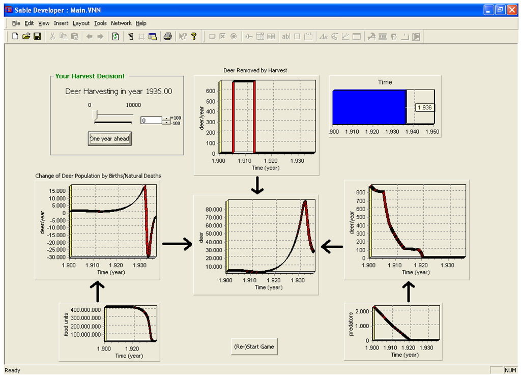 In the simulation, the model is used with one extension: Now, users can decide—for each simulated year—on a “harvest rate” of deer (meaning either the hunting of deer or the transfer of deer to other regions). By sensibly controlling the number of deer, it is possible to avoid the enormous increase of deer and the subsequent collapse of the population due to too little food available. The deer harvest rate is the only decision users have to make. The user interface of the simulator is depicted in Figure 2. The model is developed using Vensim [40]; the user interface is programmed in Sable [41] (for another version of a Kaibab simulator see [42]; in their simulator the number of predators can be controlled by subjects as well). The goal for subjects is to stabilize the deer population on the highest level possible over the total simulation run.