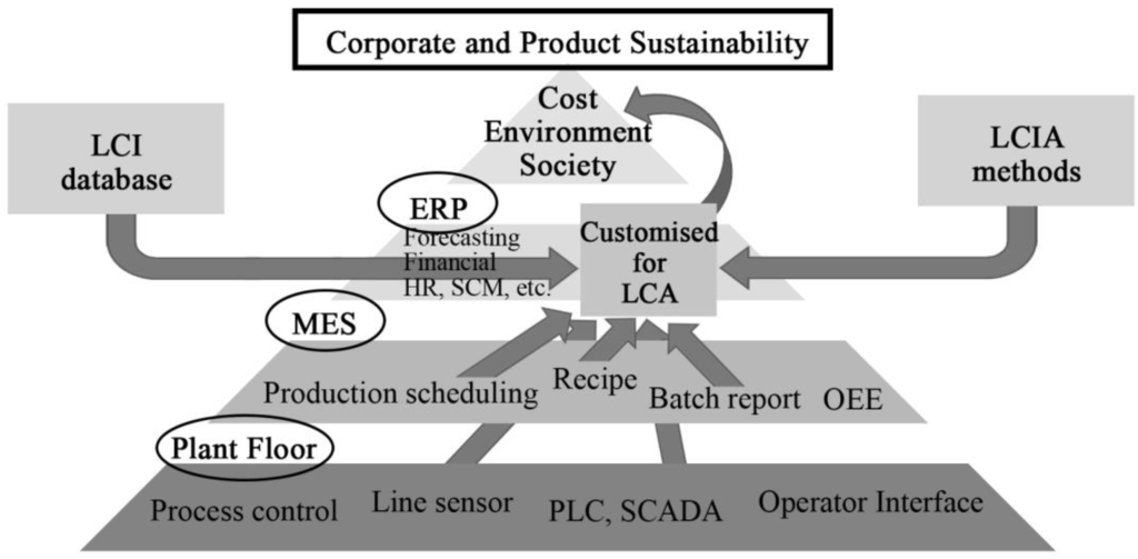 The previous topic highlighted some of the most abundant bottlenecks experienced in implementing sustainability assessments through Life Cycle Assessment (LCA), related to operational management within manufacturing and Supply Chain (SC) environments. Figure 2 illustrates a highly simplified integration of IT/ICT tools in manufacturing environments, where several layers can be distinguished [29,30]. Bearing in mind the tools and principle heritage of Lean Manufacturing and Six Sigma Management, everything starts at the Plant Floor or ”Gemba”, the place where value is essentially created [31,32,33,34]. On the Floor, the bottom up construction of data systems starts with sensors based on all kinds of technologies (volume sensors, mass sensors, structure sensors, temperature sensors, etc.). Most of these sensors send data signals at predefined intervals to logging systems such as Supervisory Control And Data Acquisition (SCADA) systems. Some process variables such as timings are inserted as queries through an Operator Interface (e.g., provided by Siemens) to be used in the construction of Batch Production Reports (BPRs), etc. The measured data is send to the next layer in the programming structure, being the Manufacturing Execution System (MES). In the MES, process data coming from the Floor is being used to create BPRs, calculate performance indicators such as the Overall Equipment Effectiveness (OEE), regulate process control systems and many more. The manufacturing data systems are connected to the corporate enterprise systems. The third layer in the framework is the Enterprise Resource Planning (ERP) system. This third layer allows enterprises to manage their resources from both a top down (production planning) and a bottom up (procurement) approach. From NGOs, policy makers, end-users and the whole stakeholder communities, questions arise on whether or not this supply chain and manufacturing is sustainable and safe. When it comes to product and organizational sustainability for purposes of Product Environmental Footprinting (PEF), Green Procurement and Product Stewardship, data seems to be lacking in order to conduct sustainability assessments proficiently. Years of intensive research by means of backwards stepwise linear regression modelling and experience proved that primary data to perform sustainability assessments often are measured through equipment control sensors (e.g., flow rates, temperatures, concentrations, pressures etc.) and sent to PLCs and many other systems [14]. Nevertheless, these engineering data measurements are in many cases simply not penetrating through the Manufacturing Execution Systems (MES) because they seem to be of little value for existing ERP applications.