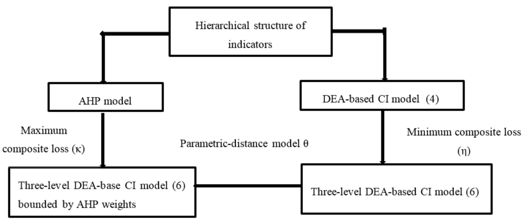 Model (6) identifies the minimum composite loss (eta) needed to arrive at a set of weights of indicators by the internal mechanism of DEA. On the other hand, the priority weights of indicators, and the corresponding (sub) categories are defined out of the internal mechanism of DEA by AHP (Figure 3).