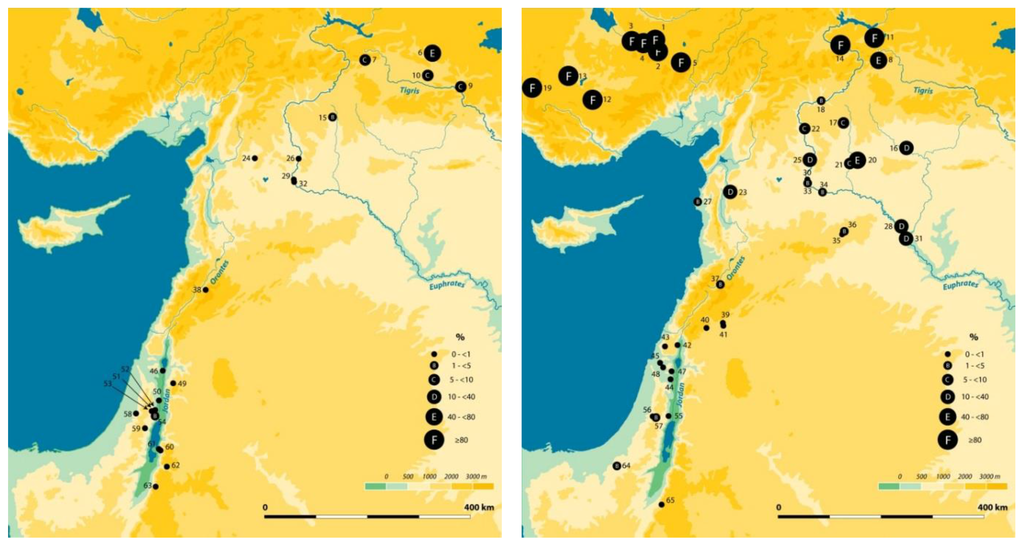 Maps with the quantity of obsidian present in the Pre-Pottery Neolithic A (left) and Pre-Pottery Neolithic B (right) sites.