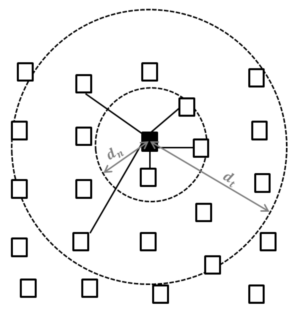 Attachment dynamics with interaction distances (neighbor distance) and (maximum travel distance).