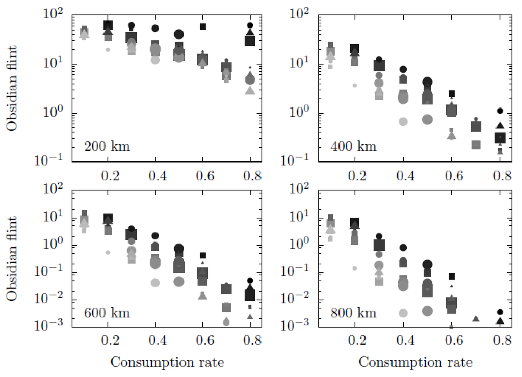First, we show the results for the sampling results in a compact form by means of a 5D-plot (Figure 3) in which we show the obsidian quantity reaching several distances (200, 400, 600 and 800 km from the northern production region) as a function of different parameters. The different dependences included in these panels read as follows: (i) the independent coordinate (horizontal axis) shows the dependence on the rate of exchange ; (ii) the shape of points represent the dependence on the number of distant links (squares correspond to , circles to and triangles to ); (iii) the size of the points shows the dependence on the number of villages (so larger points correspond to larger ); and (iv) the opacity of the points shows the dependence on the distance (with darker points corresponding to larger ). As observed, the two parameters for which a clear tendency is found are and ; accordingly, smaller values of and longer distances clearly lead to higher obsidian quantities at all distances from the production region. Instead, for the other parameters, tendencies are barely observed in Figure 3; of course, this does not necessarily mean that such tendencies do not exist but that they are possibly masked by the strong influence that the parameters and exert in the multi-parameter analysis. An analogous plot to Figure 3, in which the opacity shows the dependence of , has been also carried out (not shown here), basically shows that does not yield any clear tendency, either. We can therefore conclude that the results in the model are strongly dominated by the two parameters and .