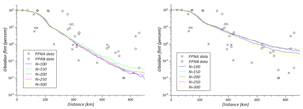 The first hypothesized model that sought to explain obsidian exchange proposed the existence of such a kind of regular network of exchange, where Neolithic villages exchanged obsidian with their neighbors and the long distances the material reached was possible via the successive transmission of the material through neighboring villages. This was called the “down-the-line” model []. However, our results indicate that a regular network of exchange, such as the down-the-line model, cannot explain the distribution of obsidian during the PPNA or the PPNB. On the contrary, our modelling shows that complex networks of exchange, where some long distance links between non-neighboring villages are present, should have existed. This possibility enables a match between our modelling and the archaeological data.
