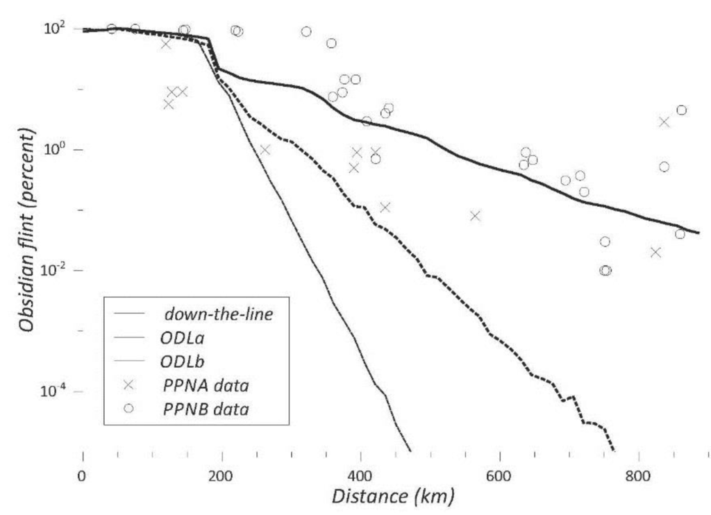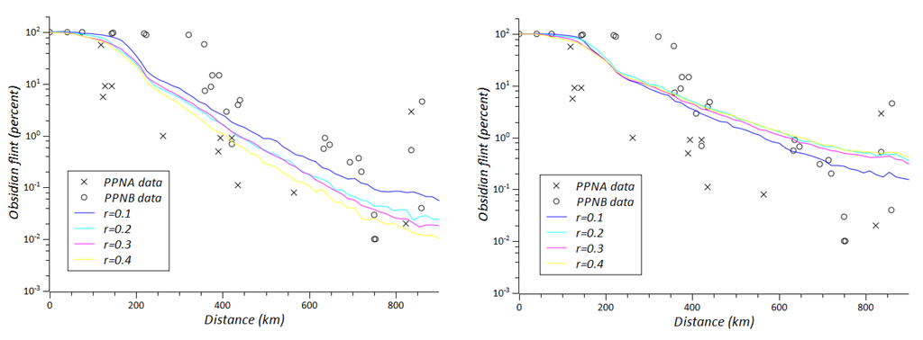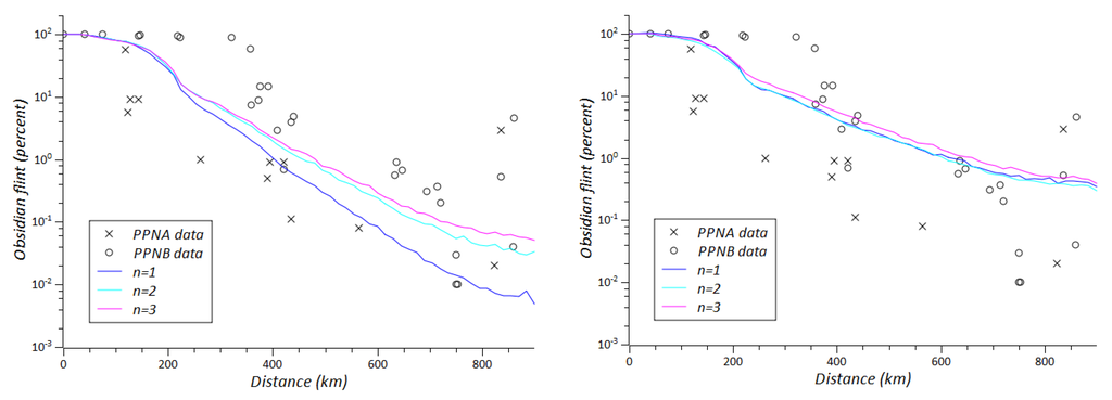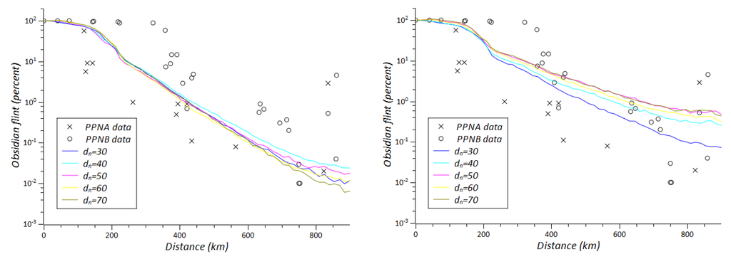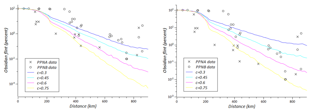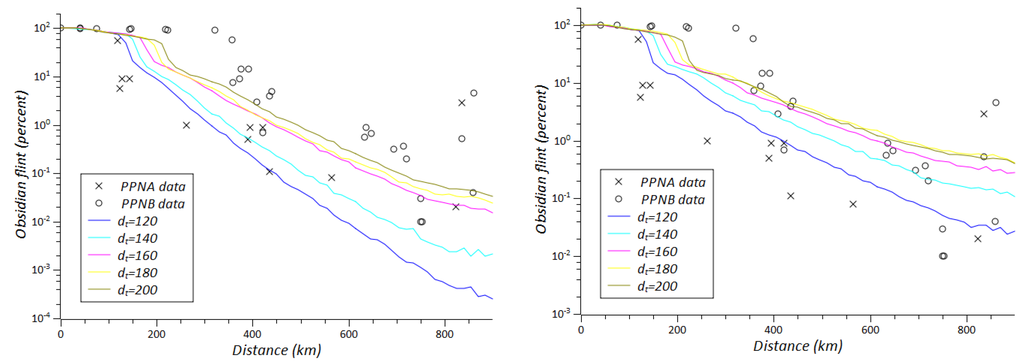 ODLa (left) and ODLb (right) model results as a function of decrement in obsidian acquisition () related to distance, compared with PPNA and PPNB obsidian archaeological data. The Y axis is represented in a logarithmic scale.