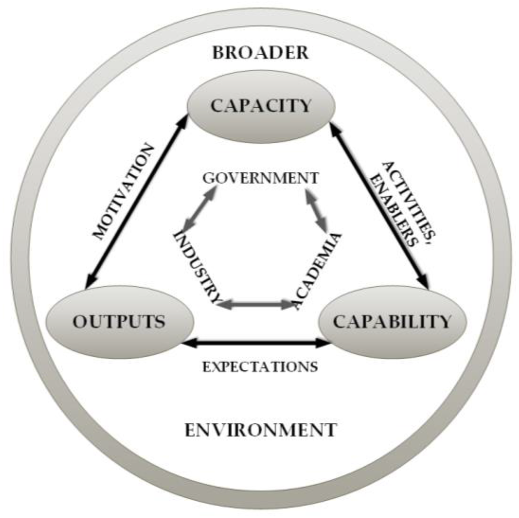 The fundamental concept of observing a systems of innovation approach [,] is that innovation should be seen as a non-linear, interdisciplinary and interactive process, requiring intensive communication and collaboration between different actors who “create, store and transfer the knowledge, skills and artefacts which define new technologies” [] (pp. 462–463). Turville [] (p. 4) points out that a country’s innovation activity depends on inter-linked activities, which include: industrial research; publicly funded basic research; user-driven research; knowledge transfer; institutions governing intellectual property and standards; supply of venture capital; education and training of scientists and engineers; innovation policies of government departments; science and innovation policies of regional development agencies (RDAs); and international scientific and technological collaboration.