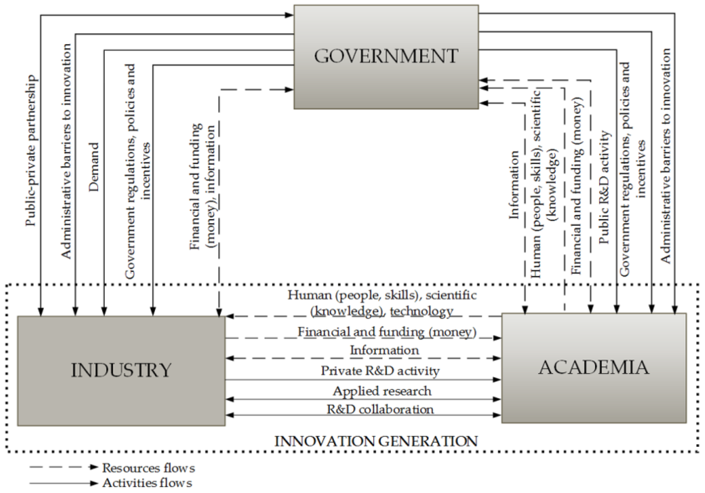 At a national level, the national innovation systems (NIS) consist of four main actors: government, research institutions, educational institutions and industry []. The system itself expresses the various networks between the actors aiming to increase the innovation capability at the national level. The networks represent government policies, social and cultural practices, laws and norms, to name a few [,,,,].