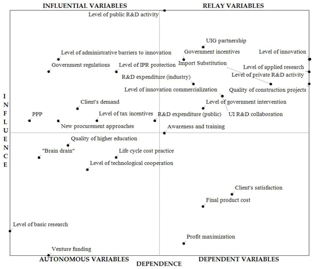- Relay variables are also important as they both influence the system and are dependent on influential variables. Besides these variables have an unstable behaviour as they could change to be input or output variables. Hence, they are dynamic variables involved in the feedback loops of the system. These relay variables include: quality of construction projects; level of public R&D activity; level of innovation; import substitution; level of applied research; R&D expenditure (industry); level of innovation commercialisation; level of government intervention; government incentives; level of private R&D activity; UIG (University-Industry-Government) partnership; UI R&D collaboration.
