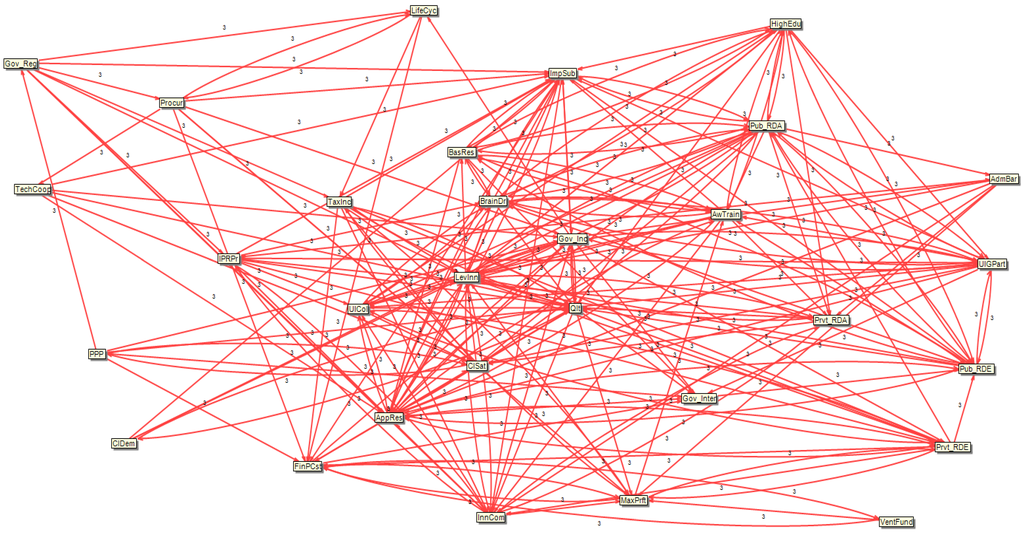 - Influential variables represent input variables that exert some influence on other elements, but are not dependent on the others. Consequently, any change in one of these variables will influence other variables and the system as a whole. Hence, they must have a priority when considering strategic actions or scenarios. These variables are: level of administrative barriers to innovation; government regulations; level of IPR (Intellectual property rights) protection; client’s demand; PPP (Public-Private Partnership); new procurement approaches; level of tax incentives; R&D expenditure (public).