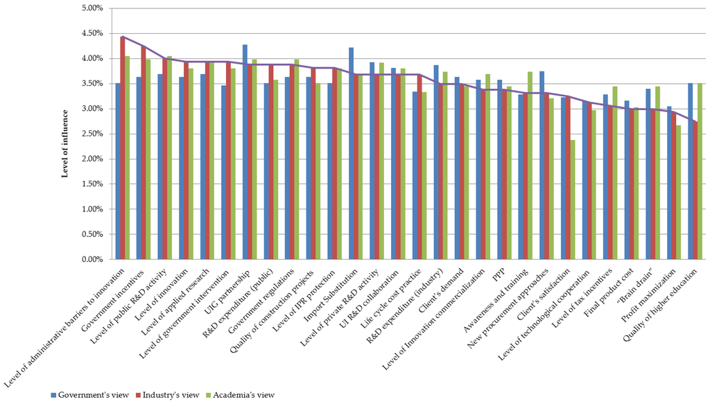 The public sector exercises a major influential role in several ways within the construction industry contributing to the system’s balance by direct and indirect measures. As a client, it can significantly influence and motivate other actors along with driving demand for science and innovation (through procurement policies) [,]. As a policy-maker and legislator, it is responsible for overall public policies, laws, regulatory framework, aspects of collaboration and governance []. The significant challenge for a government is to make industry and research institutions collaborate in an innovation process. To achieve this, supporting funding aspects and incentive mechanisms should become more efficient.