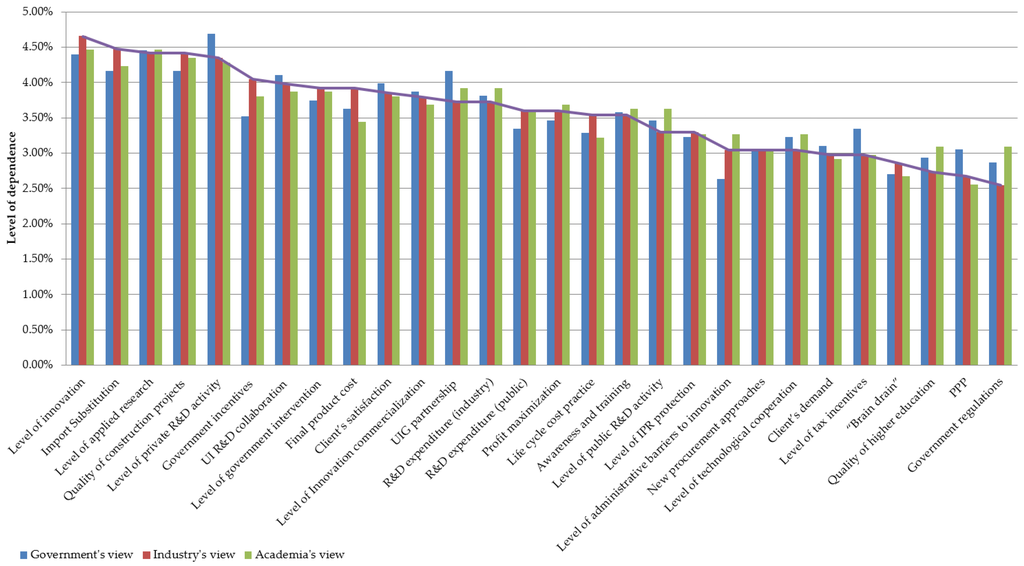 The views of stakeholders representing construction firms where innovation takes place tended to support the relationships in these figures. In Figure 6, it can be seen from all three perspectives (i.e., government, industry and academia) that level of public R&D activity, level of applied research, government regulations, level of private R&D activity and UI R&D collaboration are ranked highly, which is in accordance with the outcomes of the exploratory study highlighting stakeholders’ focus on public strategies and collaboration metrics. It is worth noting, that level of administrative barriers to innovation, government incentives, level of government intervention and level of IPR protection are seen to be more influential variables by industry and academia, as they are by the actors who generate innovation. As mentioned above, barriers related to government actions are the most significant impediments to innovation in the Russian construction industry. Consequently, these characteristics are fundamental for effective innovation system building. As for the government view, partnerships between universities, research institutes, the government itself and industry seem to be the most influential variables, mainly for supporting innovative pilot projects. Interestingly, public servants prefer the industry to take more initiatives in innovation performance improvement by increasing private R&D expenditure and undertaking more research activities. In addition, import substitution is a big issue in the development of many industries, including building materials manufacturing and construction sectors in Russia due to the imposed Western sanctions. In accordance with this, “brain drain” and quality of higher education are ranked as highly influential factors by government representatives. In terms of the variable dependency of key variables in the construction innovation system, stakeholders from all three groups agreed that the level of innovation and innovation system outputs (i.e., quality of construction projects, final product cost, client’s satisfaction and profit maximisation) are highly dependent.