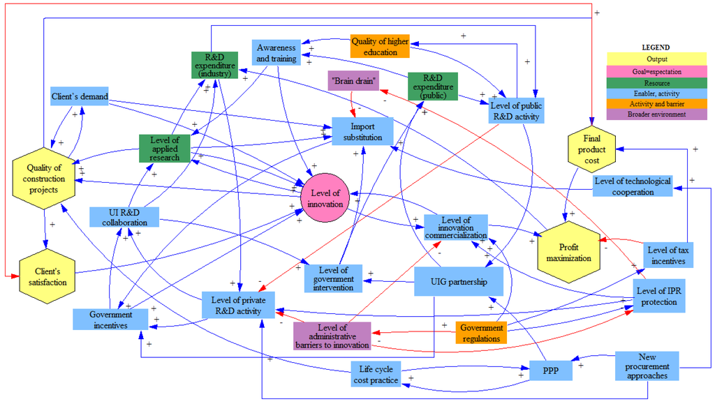 The one overarching goal of this study was to present the Russian Federation construction innovation system as a model. Considering the qualitative nature of the model and the complexity of the system, a systemic approach was demanded to visualise its elements and to quantify the relevance of relationships between them. A participatory and integrated modelling approach was deemed to be effective in building an initial casual loop diagram.