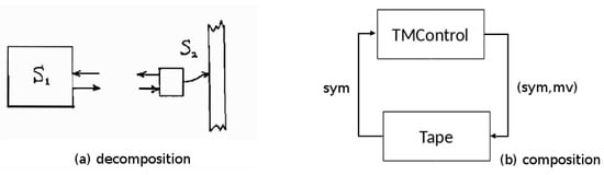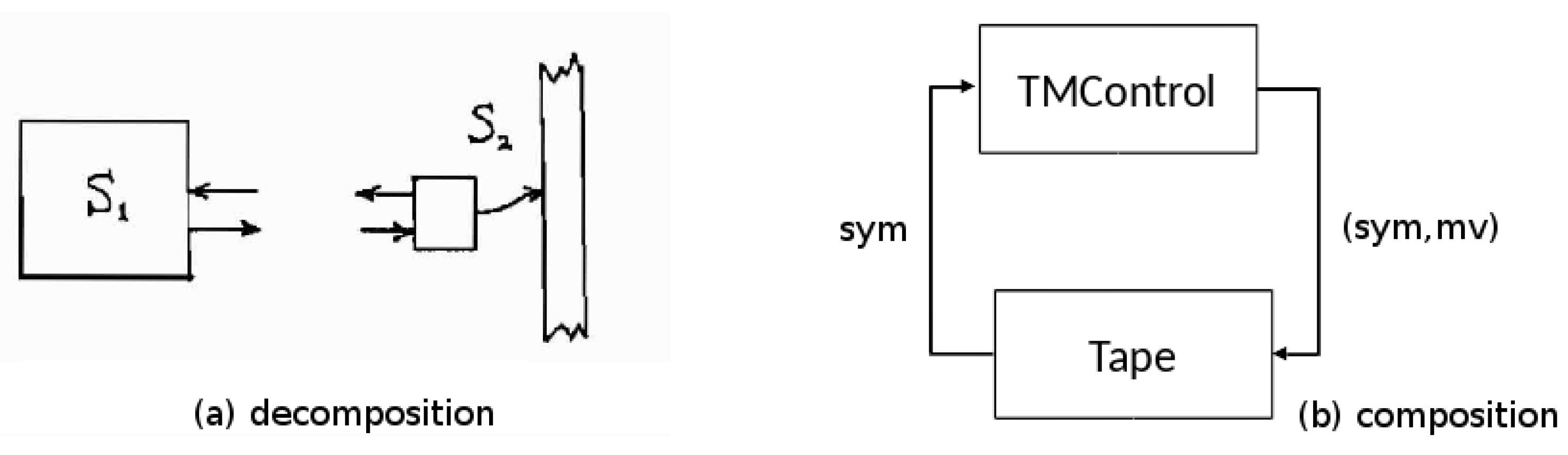 Let us start with a well-known concept, the Turing Machine (TM) (cf. [9]). Usually, it is presented in a holistic, unitary manner but as shown in Figure 1b, we can decompose it into two stand-alone independent systems: the TM Control () and the Tape System, (). Foo and Zeigler [4] argued that the re-composition of the two parts was an easily understood example of emergence wherein each standalone system has very limited power but their composition has universal computation capabilities. Examining this in more depth, the Tape system shown in Figure 1a is the dumber of the two, serving a memory with a slave mentality, it gets a symbol (sym) and a move (mv) instruction as input, writes the symbol to the tape square under the head, moves the head according to the instruction, and outputs the symbol found at the new head location. The power of the Tape system derives from its physicality—its ability to store and retrieve a potentially infinite amount of data—but this can only be exploited by a device that can properly interface with it. The TM Control by contrast has only finite memory but its capacity to make decisions (i.e., use its transition table to jump to a new state and produce state-dependent output) makes it the smarter executive. The composition of the two exhibits “weak emergence” in that the resultant system behavior is of a higher order of complexity than those of the components (logically undecidable versus finitely decidable), the behavior that results can be shown explicitly to be a direct consequence of the component behaviors and their essential feedback coupling—cross-connecting their outputs to inputs as shown by the arrows of Figure 1b. We are going to use this example to discuss the general issues in dealing with such compositions.