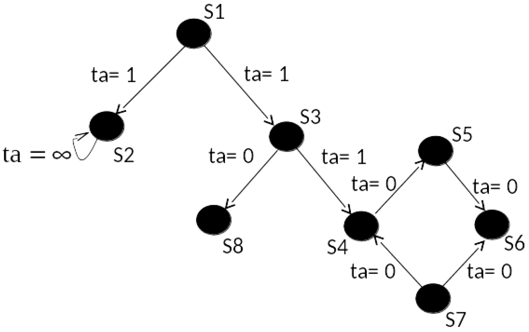 We say that the system is well-defined if it is defined at all its states. These conditions are relative to static properties, i.e., they relate to states not how the states follow one another over time. In contrast, state trajectories relate to dynamic and temporal properties. When moving along a trajectory, we keep adding the time advances to get the total traversal time, e.g., the time taken to go from S2 to S4 is 2. Here, a trajectory is said to be progressive in time if time always advances as we extend the trajectory. For example, the cycle of states is not progressive because as we keep adding the time advances the sum never increases. Conceptually, let us start a clock at 0 and, starting from a given state, we let the system evolve following existing transitions and advancing the clock according to the time advances on the transitions. If we then ask what the state of the system will be at some time later, we will always be able to answer if the system is well-defined and progressive. A well-defined system that is not progressive signifies that the system gets stuck in time and after some time, it becomes impossible to ask what the state of the system is in after that time. Zeno’s paradox offers a well-known metaphor where the time advances diminish so that time accumulates to a point rather than continue to progress and offers an example showing that the pathology does not necessarily involve a finite cycle. Our concept of progressiveness generalizes the concept of legitimacy for DEVS [10] and deals with the “zenoness” property which has been much studied in the literature [11]. We return to it in more detail later.