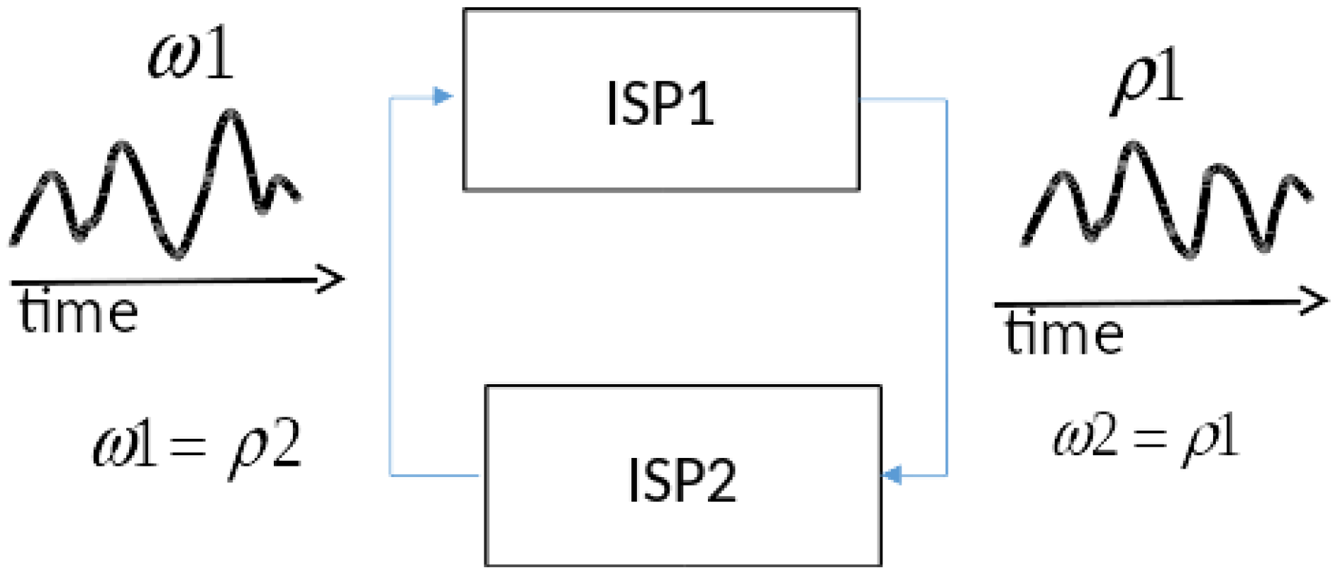 Although closure of coupling holds for DEVS, the generalization to iterative specification does not immediately follow. The problem is illustrated in Figure 4 where two iterative system specifications, ISP1 and ISP2, are cross-coupled such as exemplified by the Turing machine example in Figure 1. The cross-coupling introduces two constraints shown by the equalities in the figure, namely, the input of ISP2, must equal the output of ISP1, , and the input of ISP1, must equal the output of ISP2, . Here we are referring to input and output trajectories over time as suggested graphically in Figure 4. Since each system imposes its own constraints on its input/output relation, the conjunction of the four constraints (two coupling-imposed, two system-imposed) may have zero, one, or multiple solutions.