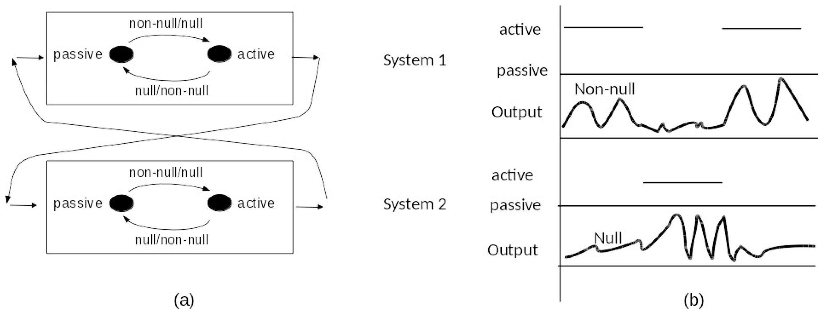 The interdependent form of the interaction between the TM control and the tape system illustrates a pattern found in numerous information technology and process control systems and recognized early on by simulation language developers [10] (though not necessarily in the modular form described here). In this interaction, each component system alternates between two phases, active and passive. When one system is active the other is passive—only one can be active at any time. The active system does two actions: (1) it sends an input to the passive system that activates it (puts it into the active phase); and (2) it transits to the passive phase to await subsequent re-activation. For example, in the re-composed Turing Machine, the TM control starts a cycle of interaction by sending a symbol and move instruction to the tape system then waiting passively for a new scanned symbol to arrive. The tape system waits passively for the sym, mv pair. When it arrives, it executes the instruction and sends the symbol now under the head to the waiting control.