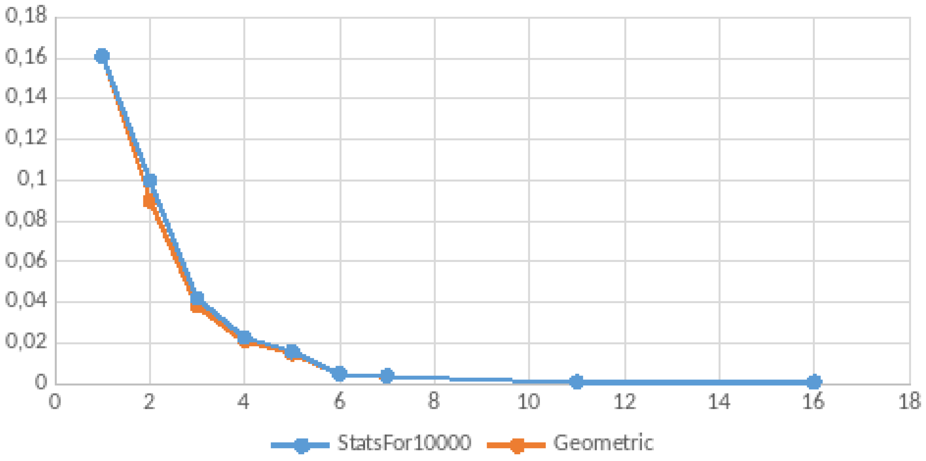 The results are shown in the first two columns of Table E2. They seem to show that TMs break into two classes—those that halt within a small number of steps (e.g., 16) and those that do not halt. Indeed, the data in the table suggest that approximately one-third of the sampled TMs halt, while two-thirds do not. For those that halt, the probability of halting at the first step is greatest and then decreases exponentially (cf. Figure E1). The third row shows the probabilities computed from a geometric success model using probability of success as 0.161. The agreement of the observed and predicted distributions are in close agreement. This suggests that for the set that will eventually halt, the probability of a TM halting at each step is approximately 1/6, given that it has not halted earlier.