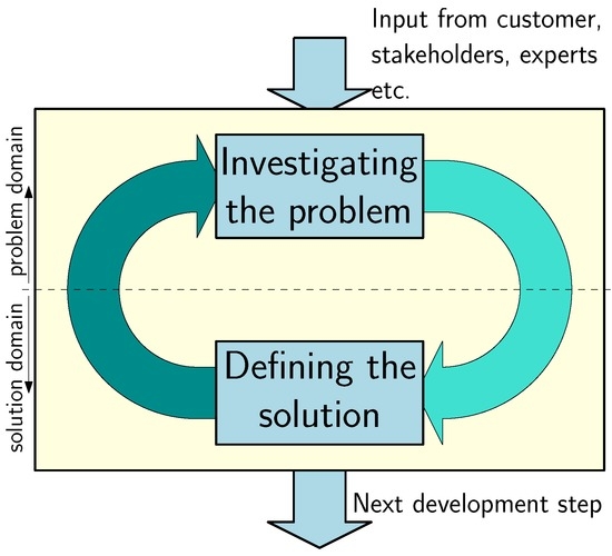 Figure 1 shows two domains: the problem domain at the top and the solution domain at the bottom. The result of investigating the problem should be an answer to “What should the system do?” and “What should the performance be?” In the solution domain, an answer is sought to the “How?” question, with the questions from the problem domain as reference.