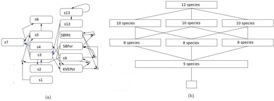 In COT, a reaction network is represented as a hierarchy of subnetworks. At the lowest level, we have the empty reaction network (0 species), and each subsequent level has subnetworks having more species. At the highest level, we find the set . This representation is known as the Hasse diagram (see Figure 1).