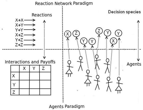 Paradigm change from agent-based (bottom) to reaction network (top) modeling. The interaction among agents corresponds to a vessel of decision species interacting, and the payoff matrix corresponds to a set of reactions which consumes a pair of decisions to produce the payoff of each decision and two new decisions determined by the strategies.
