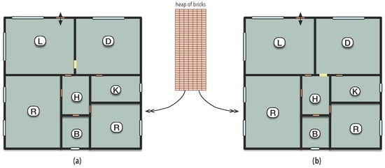 Two distinct houses obtained from exactly the same bricks. Due to a minimal position change, the yellow door connects the living and dining rooms in (a) and the hall and the dining room in (b).