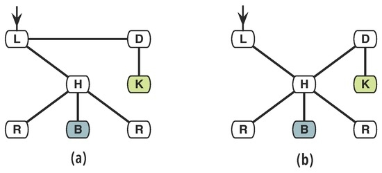 The ground access organisation of the two houses in Figure 1, respectively graphs (a,b). The new position of the door substantially changed their basic organisation.