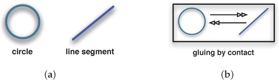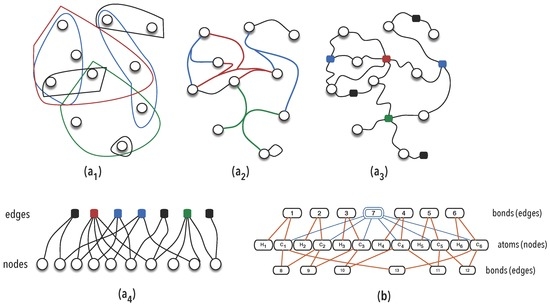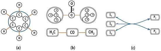 As hinted in Figure 3 and Figure 4b, associations will be represented by hyper-graphs [97,98]. Arcs of graphs can connect at most two nodes. Edges of hyper-graphs may connect any number of nodes. The choice for hyper-graphs is justified for two reasons at least. First, it provides a simple and uniform description of delocalised bonds, or electron bonds embracing more than two atoms. For instance, the benzene ring is representable as a hyper-graph with 12 nodes , 6 carbons and 6 hydrogens and 13 edges: six binding hydrogens to carbons , six binding subsequent carbons , where , in the ring and one connecting all six carbon atoms , as shown in Figure 3a.