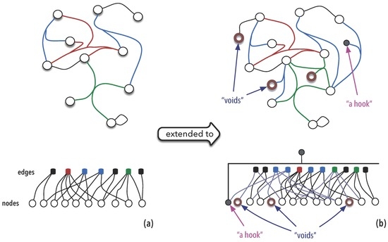 Extending hyper-graphs: the hyper-graph shown in (a) both with hyper-edges and as a bipartite graph is extended (b) by adding a ‘hook’ and some meta-variables (voids).