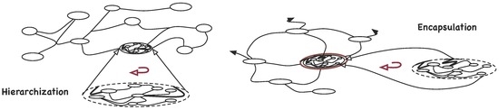 One of the most conspicuous characteristics of life phenomena is alternatively named architectural structure or organisation [11,12,27,28,29]. Both terms refer to the same idea—the relative position, connection, or interaction channel of things and thing components with respect to one another, that become hierarchically arranged as a consequence of encapsulation into wholes or units [30]. Organisation is a central characteristic of biological entities and biological phenomena [1,11,14,27,28,31,32]. Organisation appears everywhere. It may be a collective aspect, as in simple oscillatory chemical reactions, consensus bio-chemical setups of cells [33], and “self-organising” phenomena; or a structural, individual-centred aspect present in macro-molecules, cell compartments, and cellular functional modules [14,34,35].