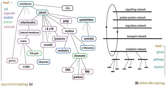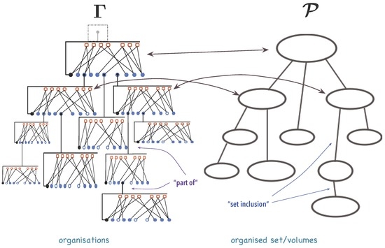 Organisation is generally associated with material instances of biological entities: modules, organelles, vacuoles, tissues etc [32]. Nevertheless, biological processes manifest organisation as well, e.g., the cytoskeleton [36], network activation-deactivation assemblies [37], chromatin, chaperones complexes [38], dynamic self-assembly processes [14], etc. Organisations expand beyond organelles and cell inner structures into tissues and organs of multicellular organisms and further on into populations, societies and cultures. Despite this ubiquitousness, instantiation of analogous organisations at different scales present seemingly uncorrelated forms [2,39]. Organisation is also frequently associated with complexity in biological entities [1,27,40,41,42]. Despite its importance and the bridge it launches with the study of more general complex systems [43], this subject shall not be pursued here beyond the contents of Section 4.2. Organising, the process of arranging and evolving organisations, shall not be addressed either.