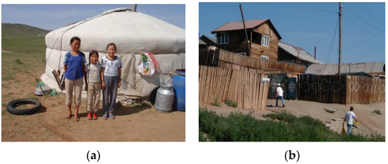 (a) Children in front of a Ger; (b) Ger area near the urban core.
