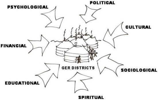 In considering the components of design and planning guidelines for ger settlements in Ulaan Baatar, it is useful to address sustainability and culture as imperative dimensions within the environment. While the most common framework for addressing sustainability in corporations and government is the so called ‘Triple Bottom Line’ (Firey [31], 1960; Elkington [32], 1999) of environment (physical), economic (financial) and equity (social), for the Mongolian case this approach is likely too narrow. A more appropriate sustainability framework, and design and planning guidelines, can be built upon the model developed by the Canadian International Development Association (CIDA [33], 1991)—especially considering the essential inclusion of both cultural and political aspects. CIDA’s Framework for Sustainable Development outlined five key areas, or pillars, that together sought to address the complexity at hand: (1) environmental sustainability, (2) economic sustainability, (3) political sustainability, (4) social sustainability, and, (5) cultural sustainability. It is worth, in the context of the present paper and in light of the proposed guideline development in Mongolia’s urban center, further detailing the CIDA frame:
