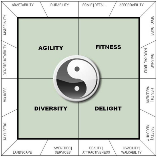 The framework incorporates four core aspects, namely agility, fitness, diversity and delight. Extending from these four essential aspects are a series of 16 more detailed dimensions of design and planning. The model assumes that all of these aspects and dimensions share equal and balanced weighting. From a systems perspective all of these items must be considered in concert when undertaking a design and planning project. It is inadequate and inappropriate to cull out and attend to only a few—although this is commonly and unfortunately the direction of many modern design and planning efforts. The framework was intentionally developed to remedy the very narrow and limited ways that much of modern design and planning transpires in both developed and developing worlds.
