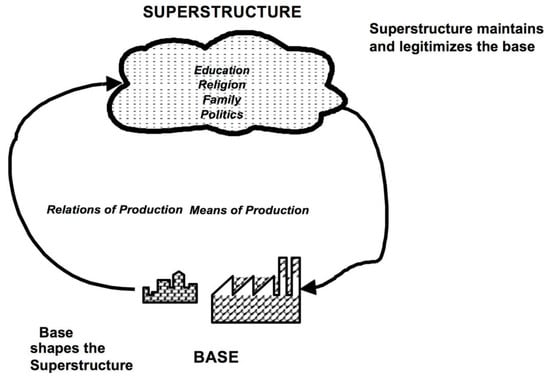 The superstructure is associated with the whole of society, including its culture, technologies, and other institutions. It is what “drives” the structure, or maybe, in human terms, it is the “reason” for the structure. The superstructure specifies not only cultural and institutional relations, but also the ways in which people interrelate in terms of their power sharing and social rituals. Using the superstructure, we regulate our interpersonal behavior in terms of learned social guidelines for human activity, so that social behavior in each society has its own specific cultural coherence. Karl Marx [12] emphasized the relation between the superstructure and the economic Structural Base in his model of society (Figure 1). The base is defined as the way a society produces what is needed to survive. The superstructure is made up of various systems including the legal, the educational, the religious, and it reflects the ideology of the society. In Marx’s theory, the superstructure is determined by the base. The means of production are controlled by the ruling class, so the interests of the ruling class are inevitably linked with the superstructure and its ideology. Therefore, because the ruling class has this important influence on production in the Structural Base and consequently on the values in the superstructure, the workers find it difficult to criticize the society. In short, the origins of the ideology are difficult to discern because they are embedded in the working and living patterns of the people. Figure 1 shows a simplified diagram of these relationships.