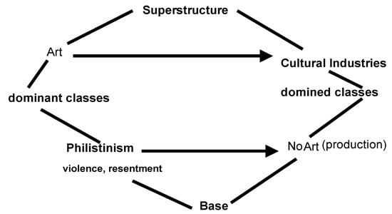 Jameson [14] defined a narrow relationship between the economy and cultural superstructure. He makes a causal connection between art and the circumstances of its creation and reception. In the history of Capitalism, a mutation of cultural forms of expression is observed, as well as of its technological bases, as artifacts adapt to changes in Capitalism during the process of globalization. The aesthetic forms defining postmodernity correspond with the phase of globalization of the market and are, thus, made fashionable by the market (Figure 2).