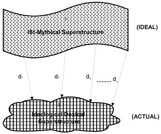 How a Subject thinks about the divergence between the ideal and the actual is called the belief distance di. A belief distance could also be between what is hoped for and what actually happens. The distances vary depending on the contexts: abstract ideals and concrete manifestations of them; ideal values and how values occur in experience; and goals we had in the past compared with our goals today. If we construct a three-dimensional diagram of superstructure with the Doxical Superstructure as a plane, the idea of belief systems can be applied to the Ist-Mythical Superstructure so it is represented as a warped plane (Figure 3). Changes of form on the plane depend on the (belief) distance between experience and the ideals concerned.