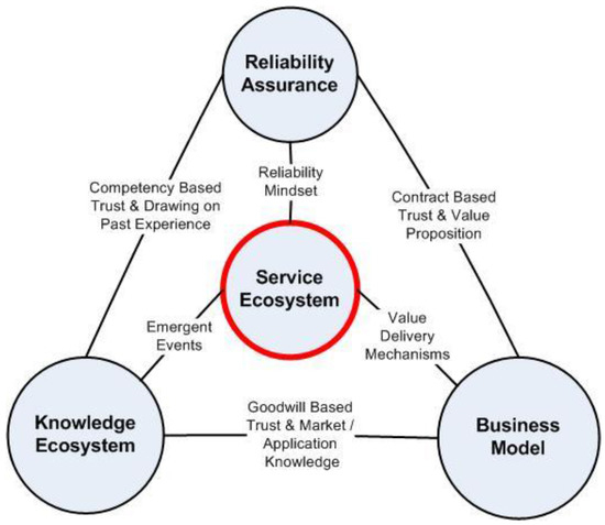 The owners/operators of complex assets such as production systems, military equipment and power stations aim to achieve high reliability with financial sustainability over long periods of time, and rely on a combination of internal and external socio-technical support systems to achieve this. Changes in the operational environment and technological advances may stimulate the need/opportunity for innovative reconfiguration of the assets and/or the related support systems. These assets and their support arrangements may be regarded as elements of a broader industry ecosystem. Drawing on analogies with natural ecosystems suggested in the literature, a concept of a service ecosystem is presented. Ten service system, management, engineering and design (SSMED) concepts elaborated by Spohrer and Kwan are represented in operational terms by interlinked networks of actors, of resources and of activities whose interconnections may change dynamically, combined with a business model perspective that indicates why particular configurations might make sense. Six support system case studies illustrate how effective service ecosystems are informed by multiple viewpoints including reliability assurance, business models and linkages with context-specific knowledge networks to stimulate the identification of innovative support solution architectures.