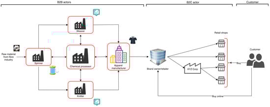 The textile supply chain is a relatively long and complex network; it involves a number of actors located worldwide and deals with diverse raw materials and processes such as fibre industries, spinning mills, weaving mills, chemical processing industries, apparel manufacturers, and retailers, beside various logistical actors involved in transportation and distribution [50]. Most of the textile supply chains are driven by the retailers or brand owners, who monitor the market demands and place the order for upstream suppliers [46]. A retailer generally does not own any production facilities and acts as a reseller who procures the products from the upstream suppliers and sells them to the customers [46]. Therefore, all the actors excluding the retailer are considered as B2B (business-to-business), whereas the retailer is considered as B2C (business-to-customer) as shown in Figure 1.