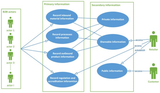 There are a large number of processes performed by each actor. As a result, there is a significant amount of information created by each actor. Information is a critical component of a supply chain, therefore it is important that each supply chain actor controls the flow and protects confidential information [52]. The use case diagram shows two layers of information, namely primary information and secondary information. Primary information consists of all the information available with a B2B actor, whereas the secondary information is the processed information generated from the primary information, a part of which (i.e., shareable information in Figure 2) can be shared with other supply chain actors. The following shows the information components of the use case diagram.