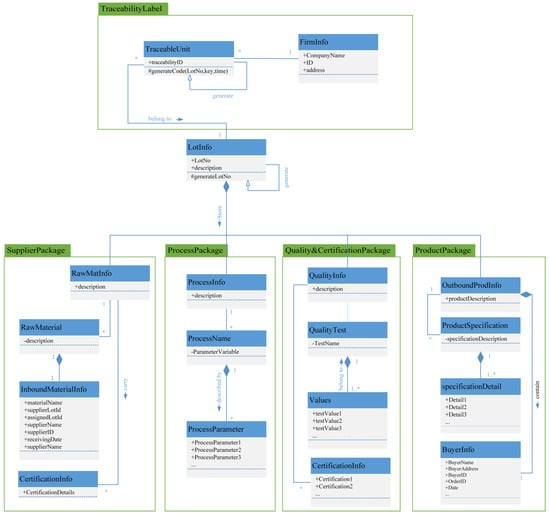 The traceability system has some core requirements for implementation including gathering and sorting product and process related data, lot forming information, upstream and downstream actor details, etc. [54]. These requirements are managed by the proper identification and classification of information, and the classification helps with easier identification of entities and relationships of various ingredients to form the traceable entity [25,54]. The traceable entity can be a batch of products, lot, or a single product. In other words, on requesting the information about a traceable unit, the supply chain actor should be able to recall the relevant traceability information regarding the traceable unit such as ingredients or constituting materials, applied processes, and supplier as well as buyer details. Many approaches have been adopted in the past to visualize the data modeling plan, including entity relation modeling (ERM) and the unified modeling language (UML) which formalize the relationship among various data entries. The ERM approach uses static entities of data and a clear relation between different entities, which allow users to design databases more naturally. However, the discrete relationship makes it less flexible and more appropriate for a clear purpose/use. On the other hand, the UML diagram is a generic modelling tool, which provides better support during comprehension of the data models as compared to ERM [55]. In the present paper, we intend to propose a generic framework which should allow the readers or subsequent studies to modify it according to their specific needs, technology of implementation, and other unforeseen concerns, which would inevitably require a better comprehension of the proposed framework; subsequently we use the UML approach. Figure 4 shows the static UML diagram model developed for implementing mutual relations among various pieces of information related to a traceable entity.