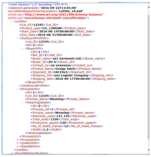 In this example, we show that the traceability ID package contains the Lot ID. However, the traceability ID can be a generated value by the function which takes the input as the Lot ID, as discussed in an earlier section of this paper. Consequently, the Lot ID can be generated by the decryption of the traceability ID (i.e., by applying the inverseGenerate function as shown earlier) and the Lot No. related information can be requested or retrieved from the database. Figure 7 shows the partial view of the XML sheets generated for a record entry, i.e., the Lot ID, from the data stored in the databases. Here the data entries are separated using opening and closing tags such as <Lot_ID> xxxx </Lot_ID>. Furthermore, the lot data is nested in the lot tags . The XML sheet in Figure 7 contains all the available information related to a lot including the critical information that the weaver may not like to disclose to the downstream buyer. As a result, the weaver trims the information and provides only the component information which is required according to the agreement with the downstream buyer. Furthermore, both parties can agree on common unified semantics such as that defined by the XML Schema Definition (XSD) to follow for exchanging traceability data. XSD defines the rules that specify the elements and structure of an XML document. Therefore, having a standardized XSD would not only help in the smoother exchange of information, but also with cross-border partner organizations that have different working languages and with a standardized format; each one needs to translate the XML tags in their known language before communicating the traceability data to the next counterpart. Figure S2 (Supplementary File) shows the XML sheet for sharing information between the weaver and the downstream buyer. As previously mentioned, a lot contains a finite number of traceability units, each having a unique traceability code. Therefore the XML sheet in Figure S2 indicates the traceability ID instead of the Lot ID, and the information is referenced with the traceability ID. However, when the downstream player needs or requests extra information about the traceability unit, the downstream actor extracts the traceability ID available on the item in the form of a barcode or RFID and sent it to the weaver. The weaver then need to decipher the Lot ID for the corresponding traceability ID and obtains the Lot ID related full information from the database to provide to the downstream actor.