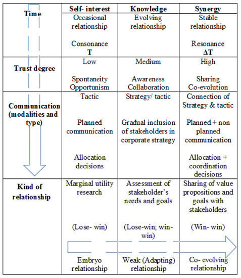 Summarizing, transitioning from self-interest relationships to synergistic relationships it can be noticed that the more relationships are stable, the more trust increases; stakeholders are satisfied both at the T and at the ΔT level and survival and viability of systems are raised. It follows that the three variables discussed above (trust, time and communication) are interrelated and influence each other bidirectionally.