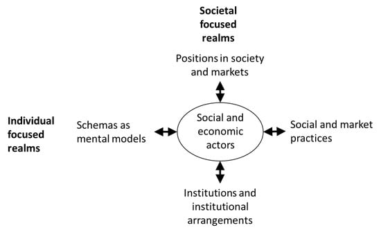 Societal-focused realms emphasize the social order that is applied in the market and society, and which guides the actor’s value co-creation. In societal realms, actors are understood as social interpreters, carriers, and enactors of identities and meaning []. The societal-focused realms contain all forces that the actors are influenced by, the collective actions performed by groups, societies, and their embedded beliefs and norms. Regulatory mechanisms, such as institutions (beliefs, norms, rules, etc.) and institutional arrangements (interdependent assemblages of institutions) are the basic conditions that enable individuals to interact with and use other resources []. The efforts of these collective actions are institutionalized through the entrenchment of institutional arrangements. Institutional arrangements provide shared meaning that makes social life coherent through the creation of social identities and reinforcement of the service ecosystem’s hierarchy [], which delineates categories of actors and defines the cognitive schemas that govern actions [,]. Institutions, institutional arrangements, and service ecosystems refer to societal-focused realms, a historical accumulation of beliefs, norms, power, and interests constructed by individuals. Ultimately, these realms become dissociated from any one individual because they generate an institutionalized social order with a longer duration than any one actor or action, manifested through social positions.