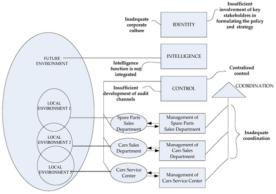 First of all, these problems refer to the fact that organizational units of the enterprise A are not clearly distinguished, and, therefore, the units, such as the spare parts sales department, the car sales department or the car service center, are not viable systems for themselves. In fact, the enterprise consists of departments for commercial affairs, human resources, etc. (Table 5). In addition, these operational elements are not adequately coordinated—for example, enterprise sales for two types of cars. Sales of one type of car is a new segment in enterprise A, which has its management and employees. On the other hand, sales of another type of car is a part of existing organizational structure. Apart from this, control is highly centralized and it is mainly in jurisdiction of top management. Audit channels are not sufficiently developed and the intelligence function is not integrated. This means that it does not exist as a separate function in the enterprise, but some elements of this function are distributed through different organizational units, such as the department for human recourses, the department for finance or the department for international trade. Furthermore, the information about threats, opportunities, strengths and weaknesses collected by these functions are not adequately distributed to the decision-makers. Namely, better cooperation between intelligence function and identity function is necessary. In addition, conducted empirical research showed that relevant stakeholders are not sufficiently involved in the process of decision-making. In addition, organizational culture does not encourage the team spirit and cooperation and it is not an innovation driver.