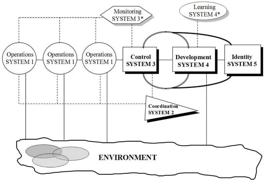 Based on the seminal work of Beer [7,8,36] and supplementary expositions by Espejo and Harnden [45], Espejo, et al. [29], Jackson [28], and Flood [46], an overview of the VSM functions follows. These functions are necessary to retain system viability for any system, including R and D organizations (systems). Stemming from application experiences [47], the VSM was supplemented with an additional system, System 4 * (read: System 4 Star), to address learning as a viable system function. Figure 2 presents the VSM structure and systems within the model.