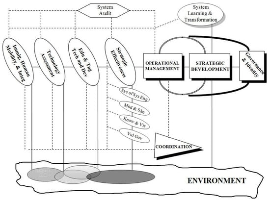 Systems science provides a robust theoretical foundation for understanding system structure. Probably the most well-known systems science theory of structure is the Viable System Model (VSM) [7,8,36]. The VSM offers a comprehensive systems perspective of structure and has been successfully applied to understand structure in a variety of organizational settings ranging from business to non-profit enterprises. The VSM is particularly appropriate for R and D organizations since it provides a template for structuring new operational designs as well as diagnosing existing operational structures. The VSM achieves balance of the system structural tensions through design of a set of functions that must be performed by any system to maintain viability (existence). Viability, according to Espejo et al. [29], is maintained by a system if “it is capable of responding to environmental changes even if those changes could not have been foreseen at the time the system was designed” (p. 105). In effect, the VSM guides effective system designs for organizations that must be sufficiently robust to operate in highly turbulent, uncertain, and shifting environments. The degree to which a system accounts for and executes the VSM system functions determines the efficacy of the system structure and ultimately influences the level of system performance.
