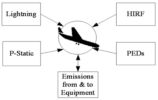 Figure 4. Electromagnetic perturbations and aircraft subsystems. HIRF: high-intensity radiated fields; P-static: precipitation static; PEDs: portable electronic devices; EMI: electromagnetic interference.