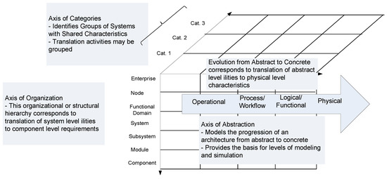 We would like to discuss the process in the context of Model-Based System Architecture Process (MBSAP). For information-intensive aerospace architecting, Borky [37] proposed using MBSAP, which emphasized hierarchical structures and procedural dynamics. In MBSAP, the physical system emerges from the conceptual system. The process flow starts with an operational viewpoint in the abstraction axis, then moves to the logical and functional viewpoint, then the physical viewpoint, and finally it comes to the build/integration/test phase. This MBSAP process, illustrated in Figure 7, approximately corresponds to architecting with ilities and their subsequent flow down to subsystems and components. Both the MBSAP process and the ilities’ flow down processes are viewed from an architectural hierarchy viewpoint, such as the abstraction taxonomy, or organization hierarchy. Figure 7 shows this point that the translation can be performed either in the abstraction axis or the organizational axis. For the organization hierarchy, the ilities are placed at the enterprise level and moves down to the node and functional domain if applicable. The next low level is the system level and ilities are worked down to the subsystem, module and finally to the component level. As discussed above, the abstraction taxonomy covers the value ilities with the operational viewpoint, and are flowed down to a less abstract level of the functional or logical, and ultimately down to the concrete physical viewpoint.