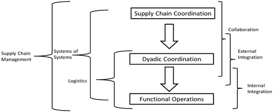 The question then becomes, where, exactly in the conceptualization of SCM, does the complementary perspective of SoS appear? SoS is inherently a multi-organizational concept, centered as it is on holistic solutions for problems between firms jointly reconfiguring inputs into market offerings ([18,23,66,67]). In our value chain perspective synthesis of integration, we suggest that external integration links the primary activities of firms, by linking processes [53] at both the strategic and operational levels [45], including informational, financial, and material flows [48] in order to more efficiently and effectively serve customers [46]. From a SoS perspective, integration functions at both internal and external levels. Thus, from the internal perspective, integration is essential to ensure that the constituent elements comprising the SoS are in fact linked such that the whole functions as a unity. In addition, integration is related to collaboration such that integration might be thought of as a byproduct of collaboration processes. Similarly, from the external perspective of integration for SoS, the different elements external to the SoS (in the environment) must be ‘integrated’ through collaboration processes. Thus, integration is achieved, both internally and externally, through collaboration processes serving to help the SoS sustainment performance. We also synthesize the literature to suggest that collaboration is an integration linkage between the secondary activities of value chains within a supply chain. This follows from collaboration’s definitions as development of common offerings by multiple firms through cooperative approaches [36], based on trust and commitment [33], calling for joint decision making and responsibility sharing [34], and forecast building [35].